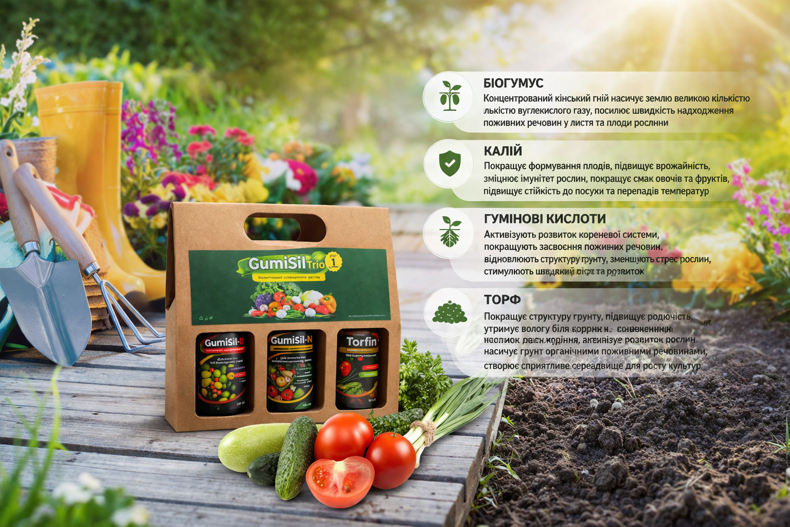 Gumisil Trio - розробка що 25 років допомагає Аграгіям України та ЄС. За допомогою цього біодобрива можна отримати гарний врожай навіть на низькородючих ґрунтах і в складних кліматичних умовах. Застосувавши Gumisil Trio на своїй ділянці, ви отримаєте дивовижні результати - врожай значно підвищиться, а вітаміни та мікроелементи, що містяться в ньому, допоможуть захистити рослину від хвороб і шкідників на весь сезон. За даними мінсільгоспу за 2025 рік за допомогою Gumisil Trio в Україні вже врятовано близько 189 тисяч тонн врожаю овочів і фруктів.
