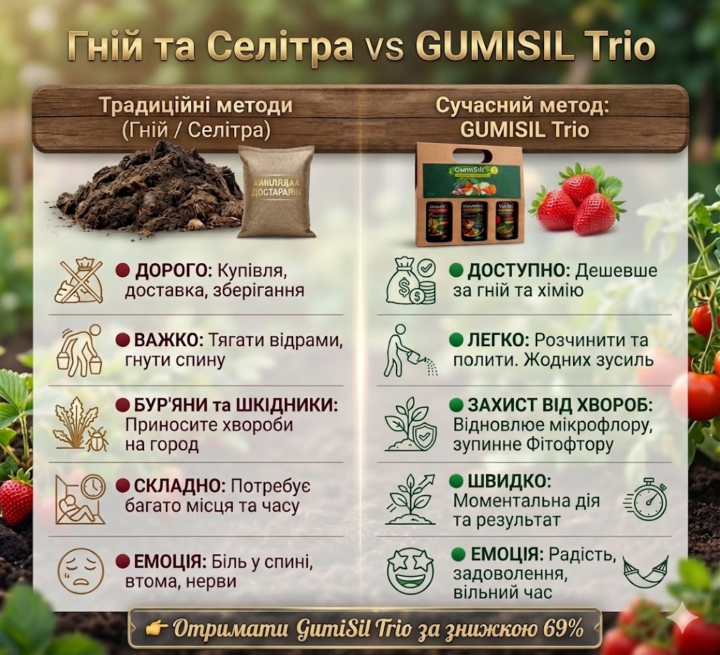 Gumisil Trio - розробка що 25 років допомагає Аграгіям України та ЄС. За допомогою цього біодобрива можна отримати гарний врожай навіть на низькородючих ґрунтах і в складних кліматичних умовах. Застосувавши Gumisil Trio на своїй ділянці, ви отримаєте дивовижні результати - врожай значно підвищиться, а вітаміни та мікроелементи, що містяться в ньому, допоможуть захистити рослину від хвороб і шкідників на весь сезон. За даними мінсільгоспу за 2025 рік за допомогою Gumisil Trio в Україні вже врятовано близько 189 тисяч тонн врожаю овочів і фруктів.